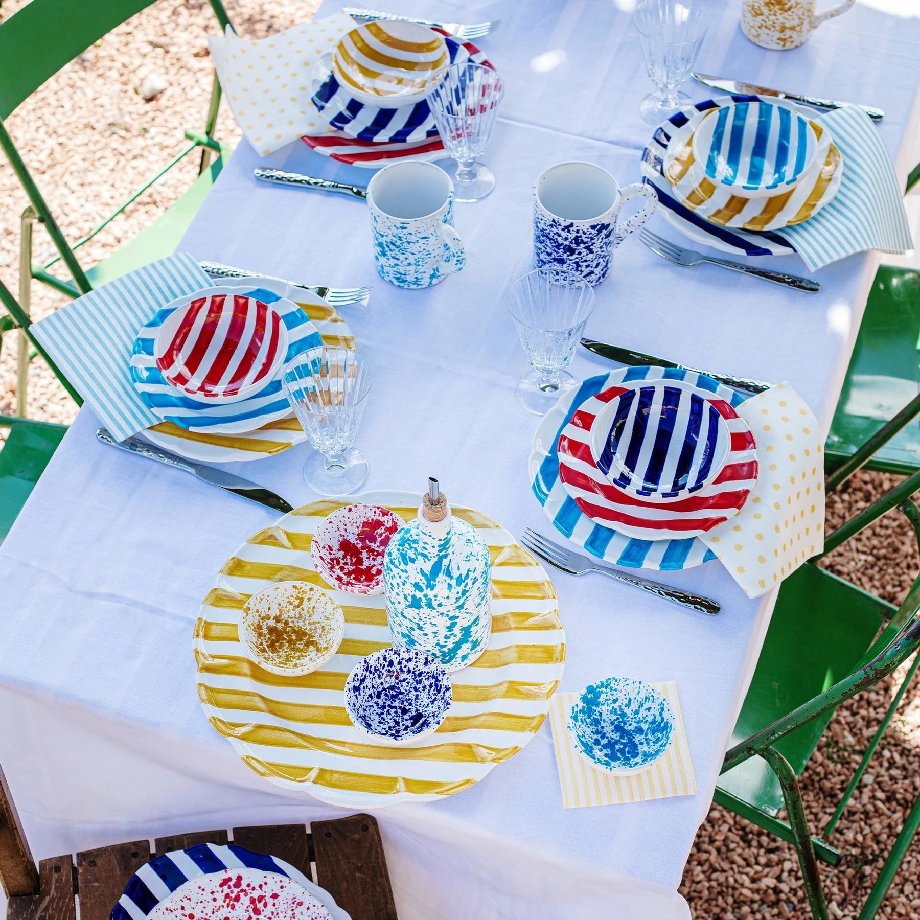 The Amalfitana Aqua Stripe Salad Plate pays homage to the Amalfi Coast’s fresh seaside style, and its bold hues and crisp design bring a vibrant and lively look to your table.