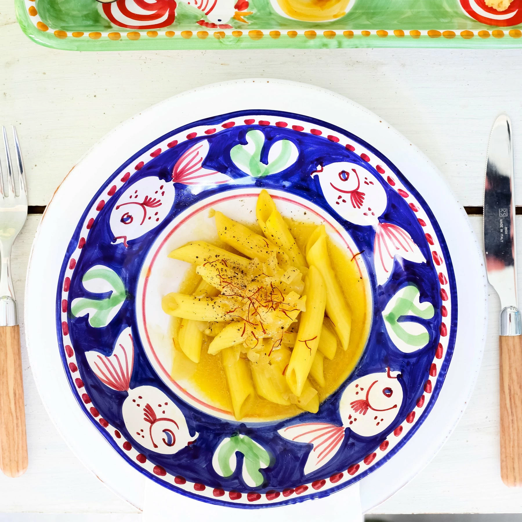The colorful blue and red Campagna Pesce Dinner Plate features whimsical handpainted fish swimming among green algae.