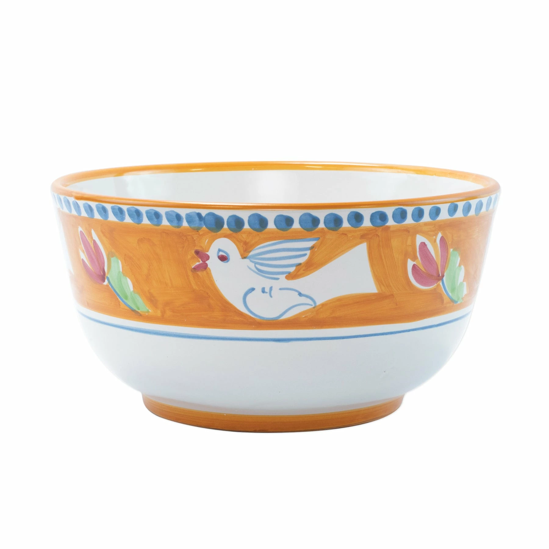 The colorful orange and blue Campagna Uccello Deep Serving Bowl features whimsical handpainted birds and flowers. Mix with other animals from the Campagna collection to create a fun table that captures the vitality of the Italian countryside!