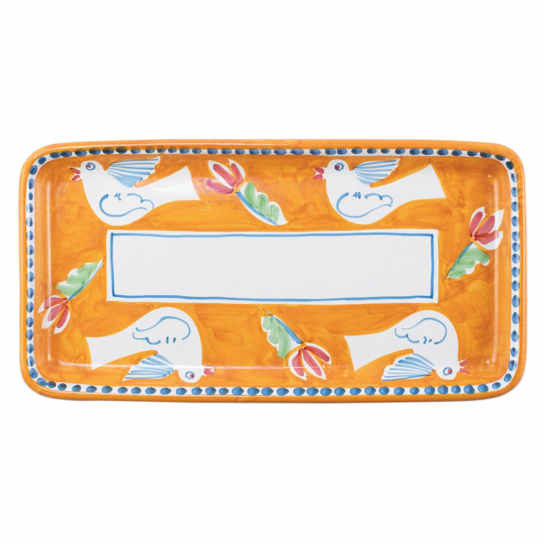 The colorful orange and blue Campagna Uccello Rectangular Platter features whimsical handpainted birds and flowers. Mix with other animals from the Campagna collection to create a fun table that captures the vitality of the Italian countryside!
