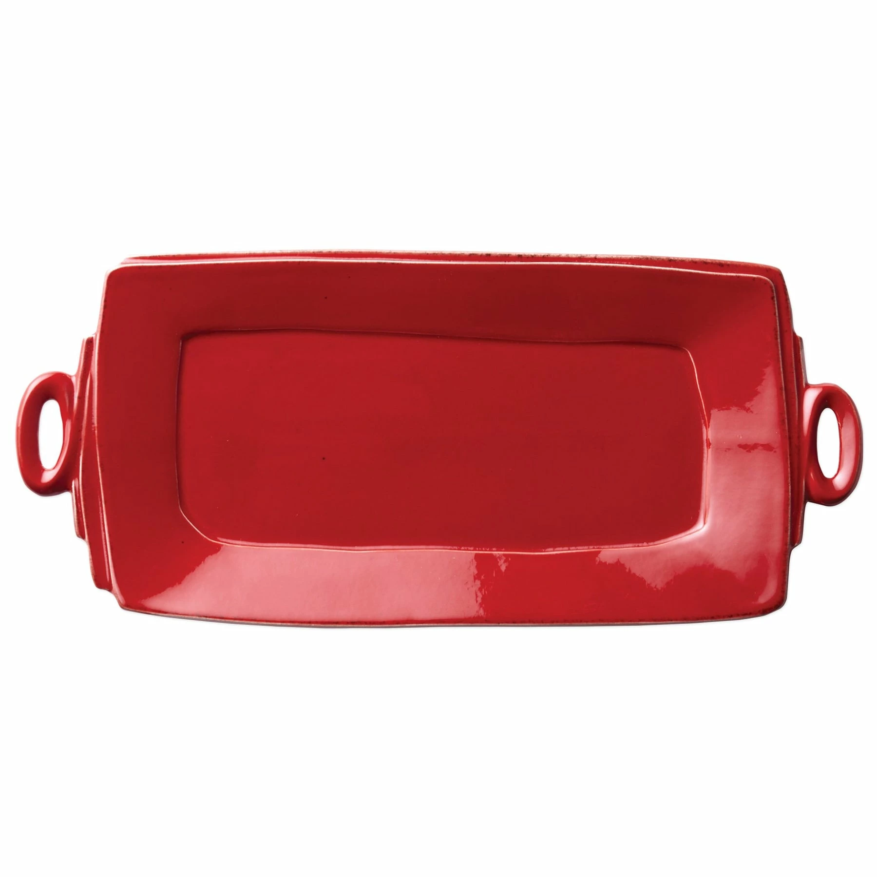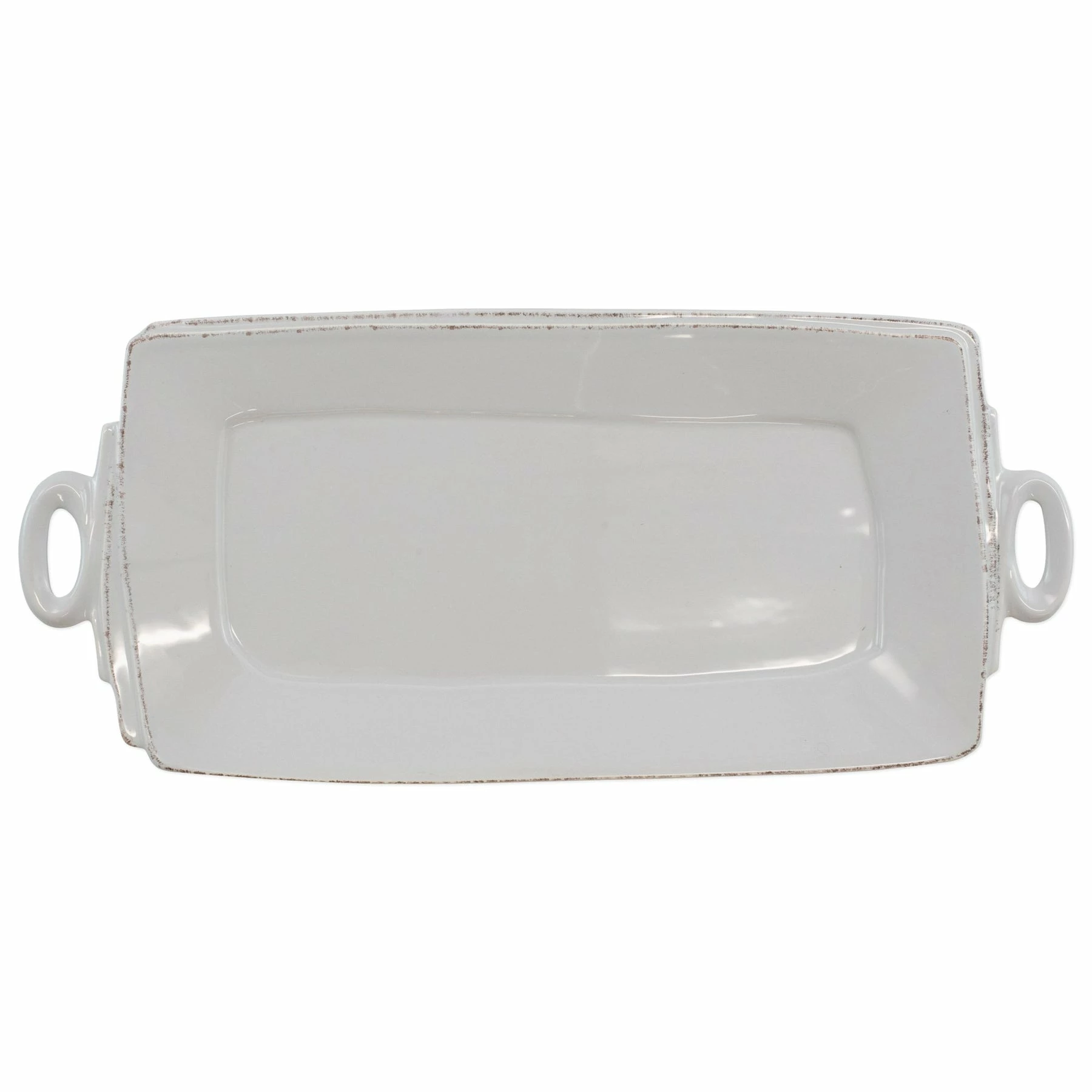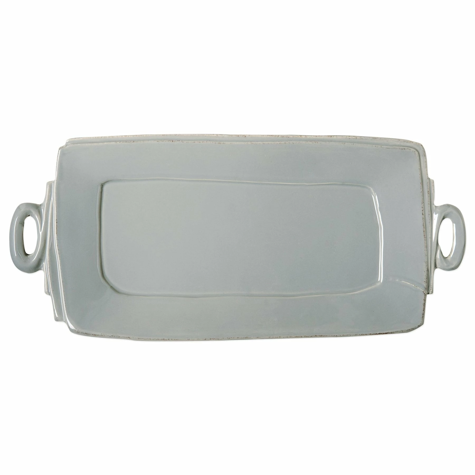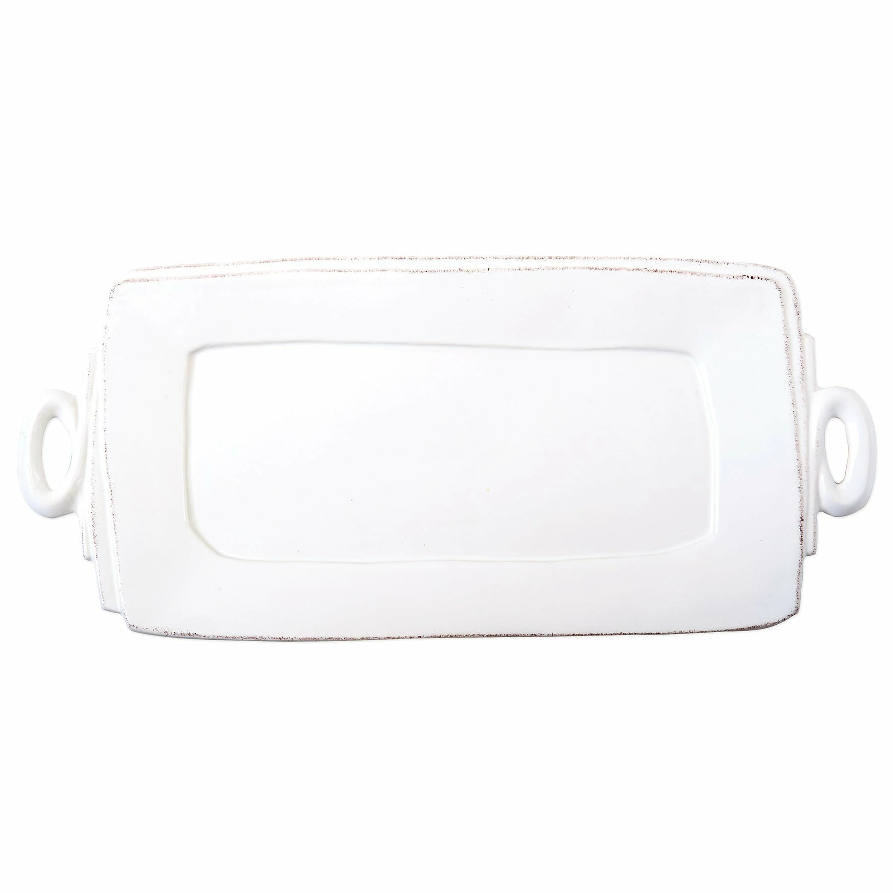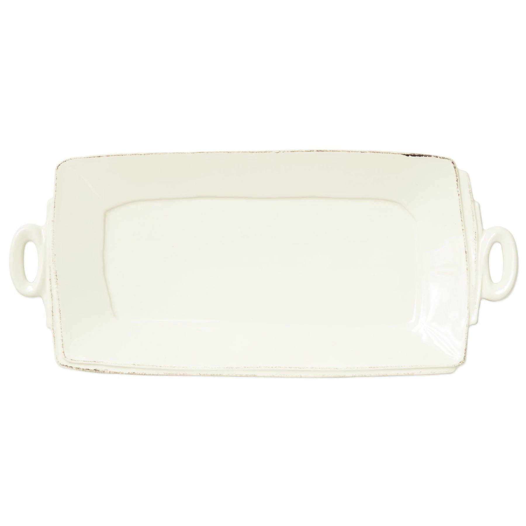 Beloved for its sophisticated simplicity, versatility, and durability, Lastra is our bestselling collection. The understated elegance, clean lines, and unique shape of the Lastra Handled Rectangular Platter make a timeless and elegant serving piece for any table. Lastra’s design was inspired by the circular wooden slabs used for centuries to create the outer mold in cheesemaking throughout Italy. When fashioned together with twine, the hoop was left with a slight overlap to help maintain the shape of the cheese mold. Maestro molder Stefano Roselli incorporates the overlapping detail into the entire design, from its foot to its rim. A dark dusting on the edges of each piece suggests the ash that was used to preserve these cheeses and highlights each unique silhouette.