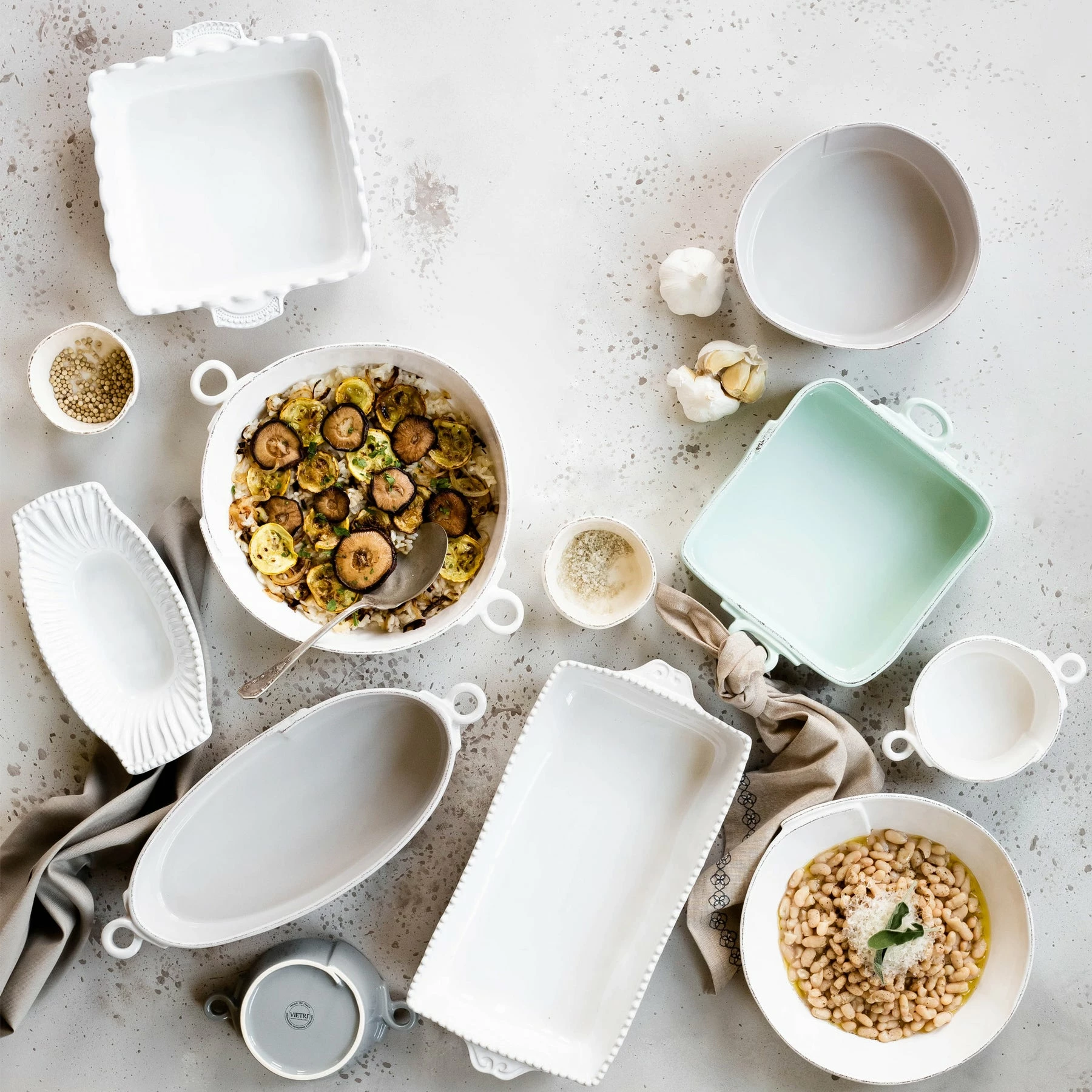 Oven Safe – VIETRI’s casserole and baking dishes can be used in most conventional ovens and dishwashers. They are handcrafted of very dense clays and fired at high temperatures, making them heat resistant up to 400°F. Do not use casserole lids in the oven, unless otherwise noted. Hot casseroles and baking dishes should never be placed on cool, damp, or unprotected surfaces. VIETRI bakeware should never be taken directly from the refrigerator to the oven due to the extreme temperature change, nor should it be placed directly from oven to freezer. The handles of these pieces are decorative and should not be used for support. Please remove the bakeware from the oven by holding the body of the dish, supporting the base.