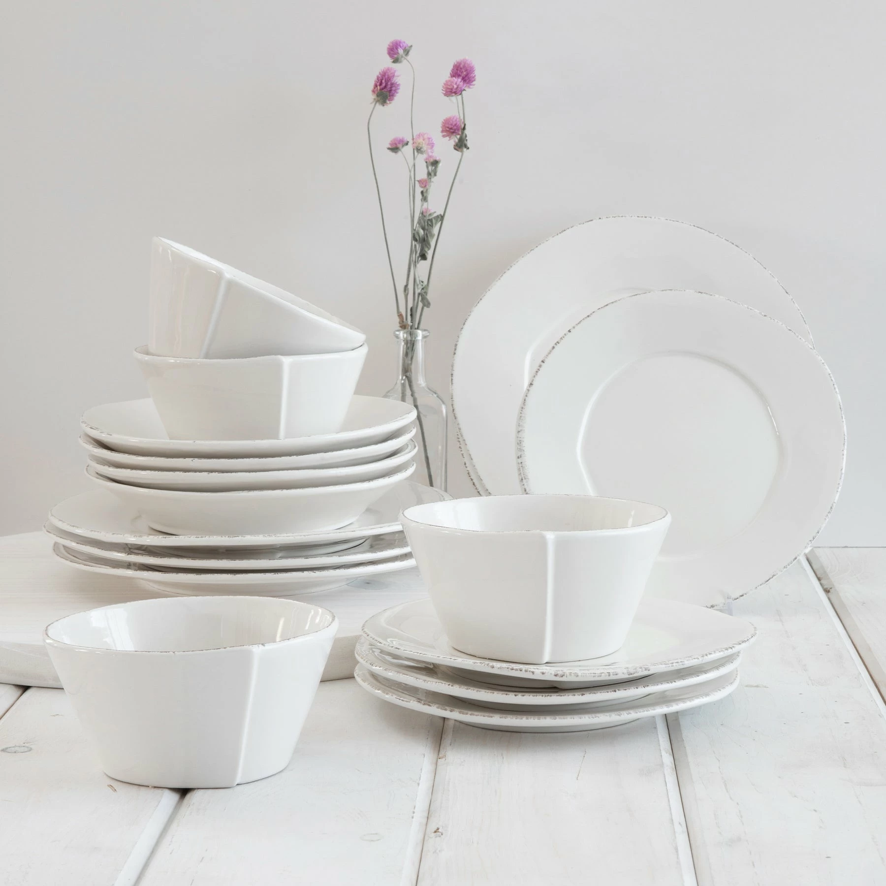 Beloved for its sophisticated simplicity, versatility, and durability, Lastra is our bestselling collection. The Lastra Four-Piece Place Setting is wonderful starter kit for a Lastra collection, and it includes 4 European Dinner Plates, 4 Salad Plates, 4 Pasta Bowls, and 4 Cereal Bowls. Lastra’s design was inspired by the circular wooden slabs used for centuries to create the outer mold in cheesemaking throughout Italy. When fashioned together with twine, the hoop was left with a slight overlap to help maintain the shape of the cheese mold. Maestro molder Stefano Roselli incorporates the overlapping detail into the entire design, from its foot to its rim. A dark dusting on the edges of each piece suggests the ash that was used to preserve these cheeses and highlights each unique silhouette.