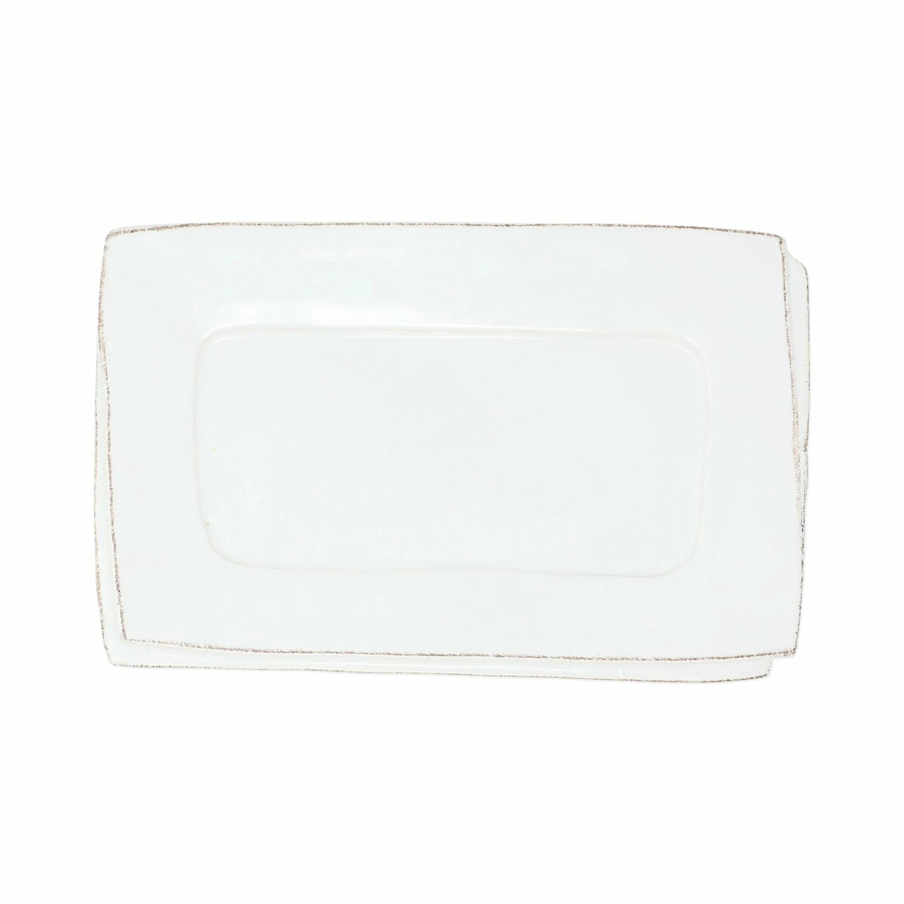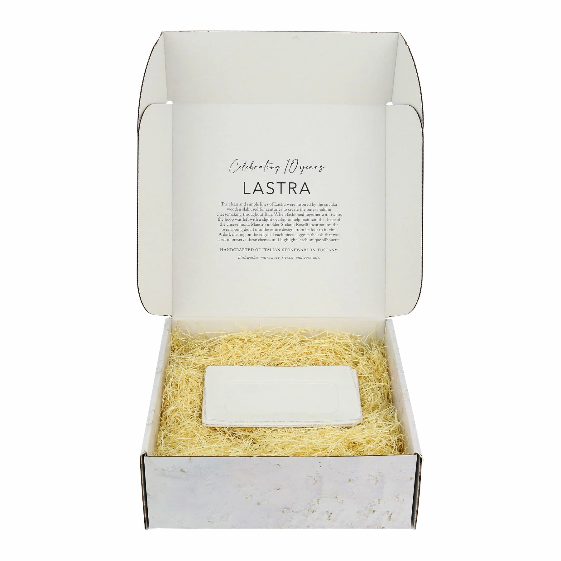 Beloved for its sophisticated simplicity, versatility, and durability, Lastra is our bestselling collection. The understated elegance, clean lines, and unique shape of the Lastra White Small Rectangular Tray make it a timeless choice for your home. Lastra’s design was inspired by the circular wooden slabs used for centuries to create the outer mold in cheesemaking throughout Italy. When fashioned together with twine, the hoop was left with a slight overlap to help maintain the shape of the cheese mold. Maestro molder Stefano Roselli incorporates the overlapping detail into the entire design, from its foot to its rim. A dark dusting on the edges of each piece suggests the ash that was used to preserve these cheeses and highlights each unique silhouette.