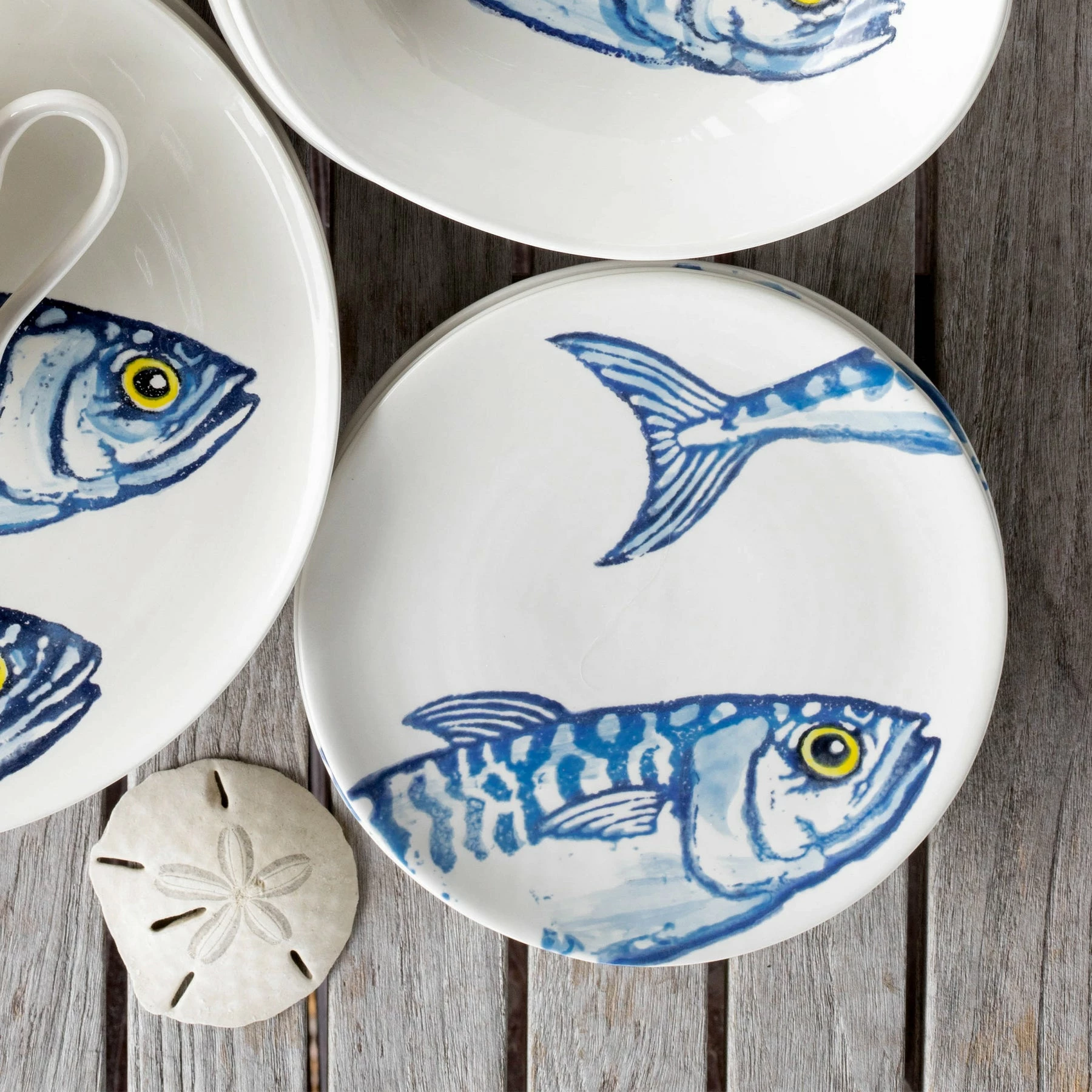 The Maccarello Salad Plate illustrates a school of blue mackerel, commonly found along the Mediterranean and Adriatic Sea, handpainted by maestro artisan, Gianluca Fabbro, using his unique sponging technique.