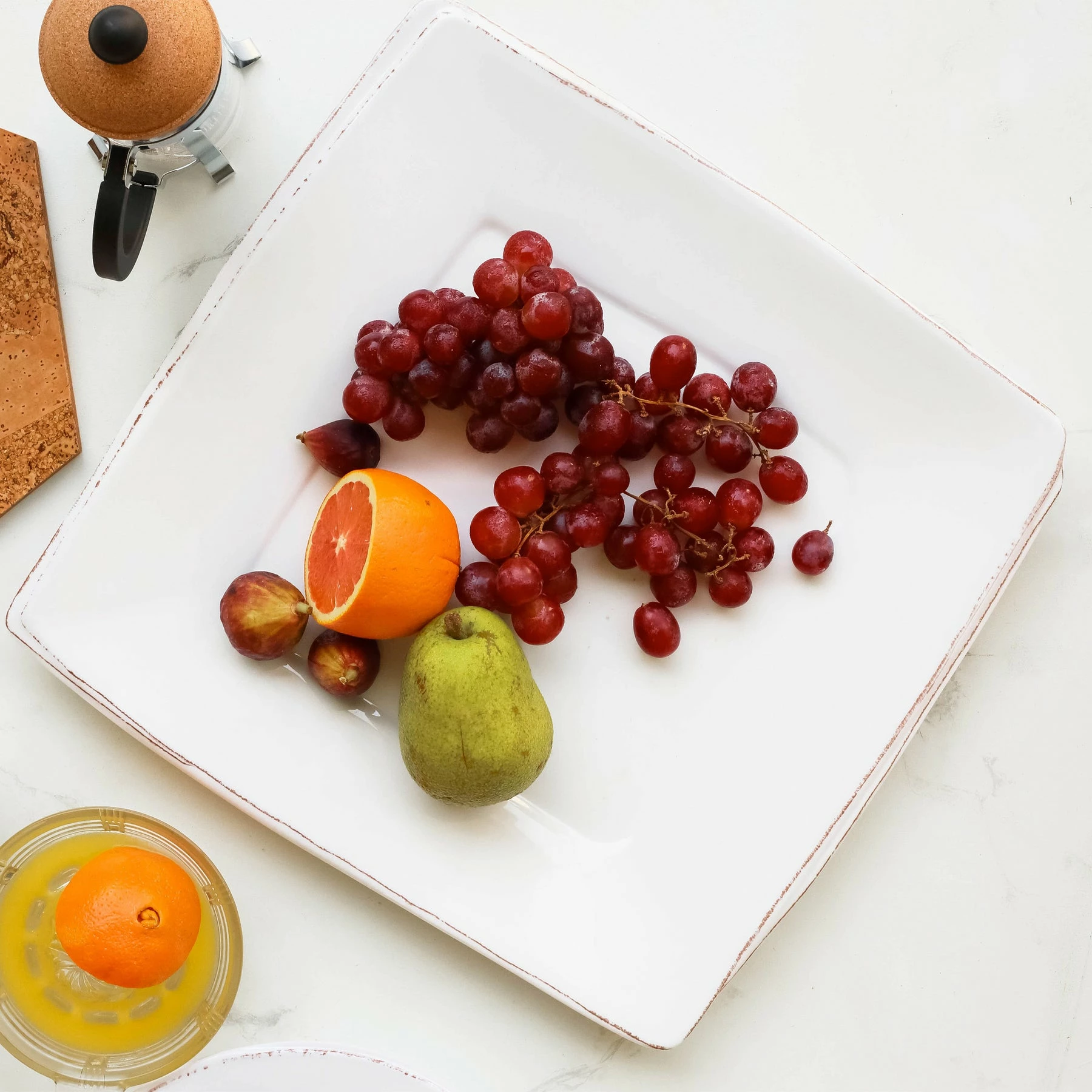Serve your guests in style with the rustically chic Lastra White Square Platter. The bright white sets the perfect background for an array of delectable meats and cheeses or homemade sweets. The versatile size and neutral color make this platter a go-to gift for any occasion.