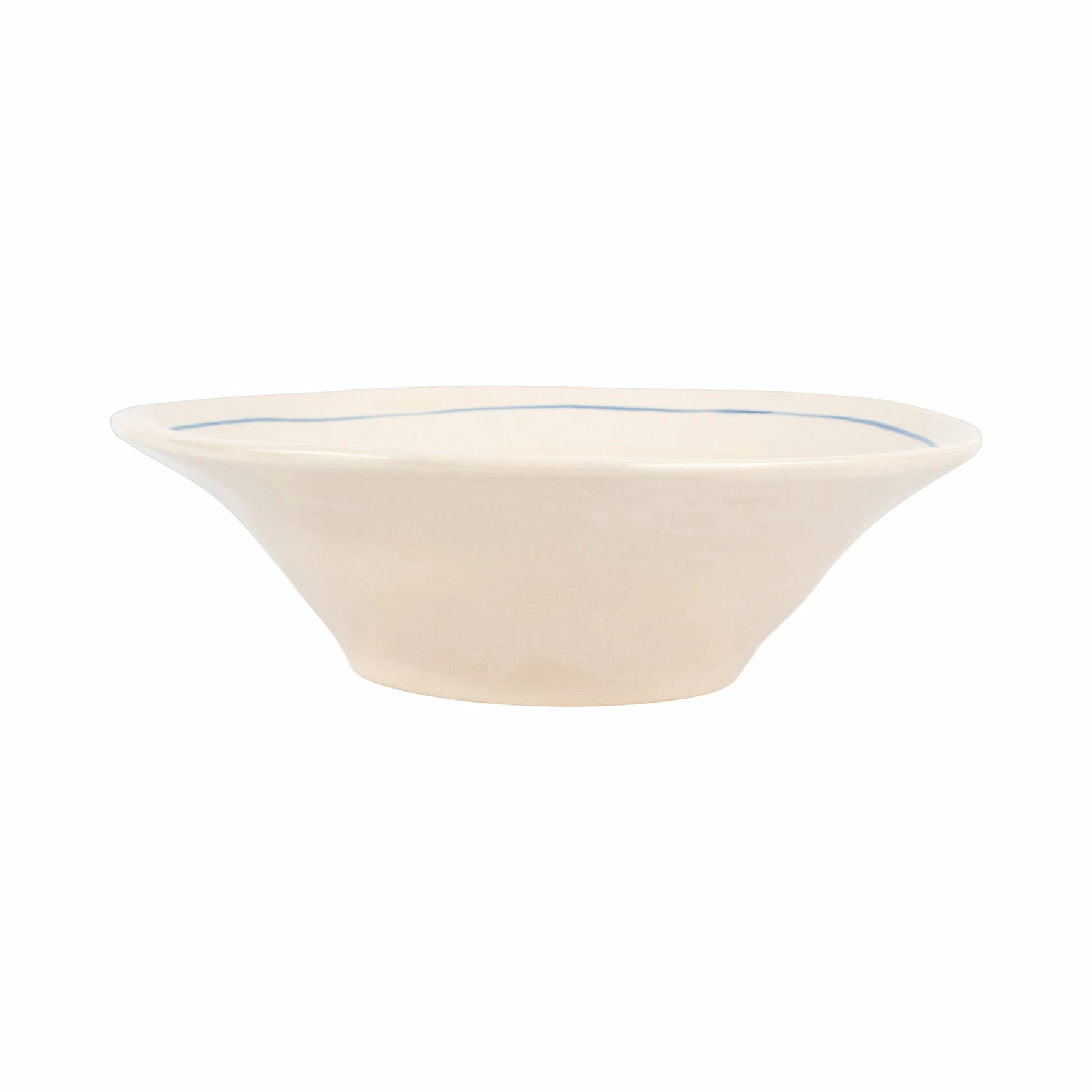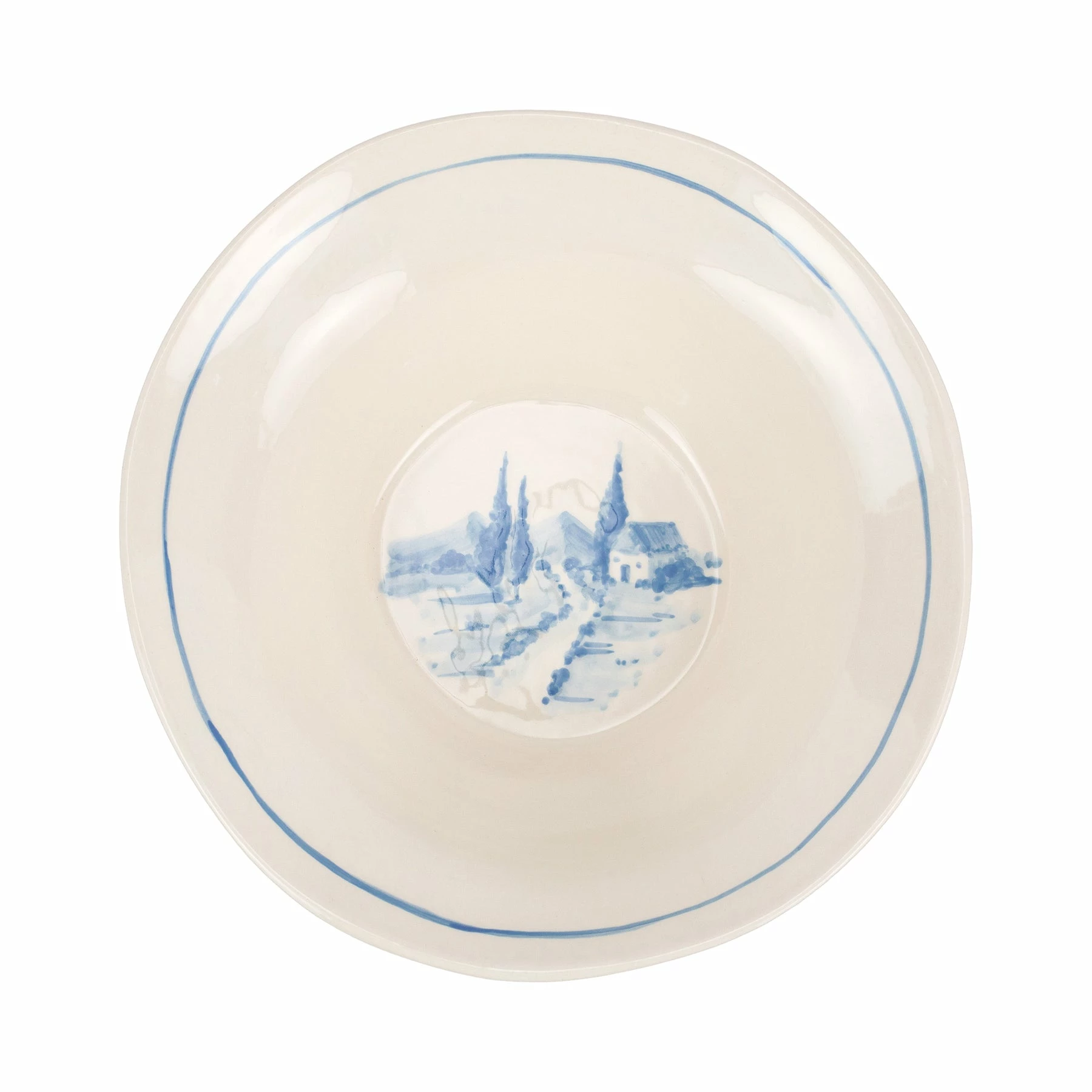 A handpainted Tuscan scene in a perennial favorite shade of light blue adorns the Modello Tuscan Large Serving Bowl.