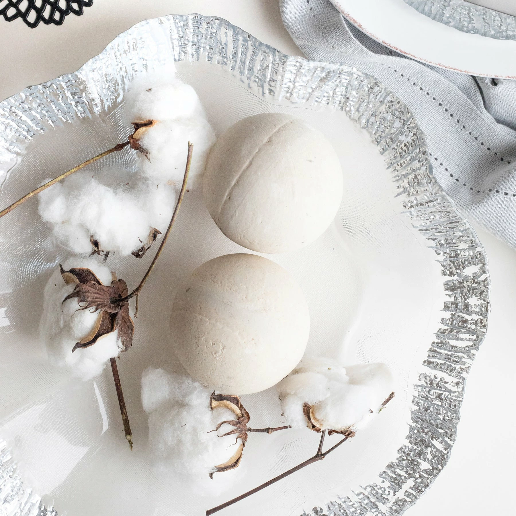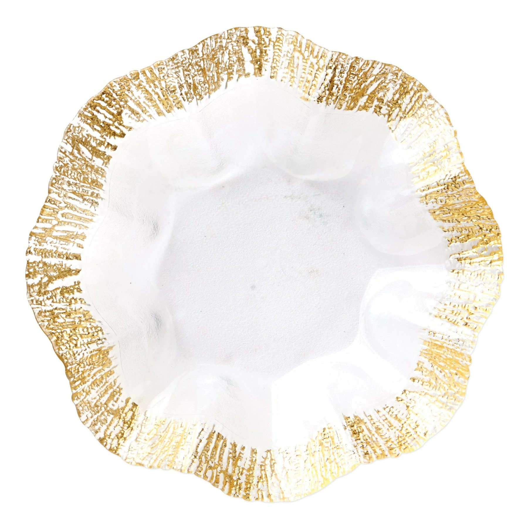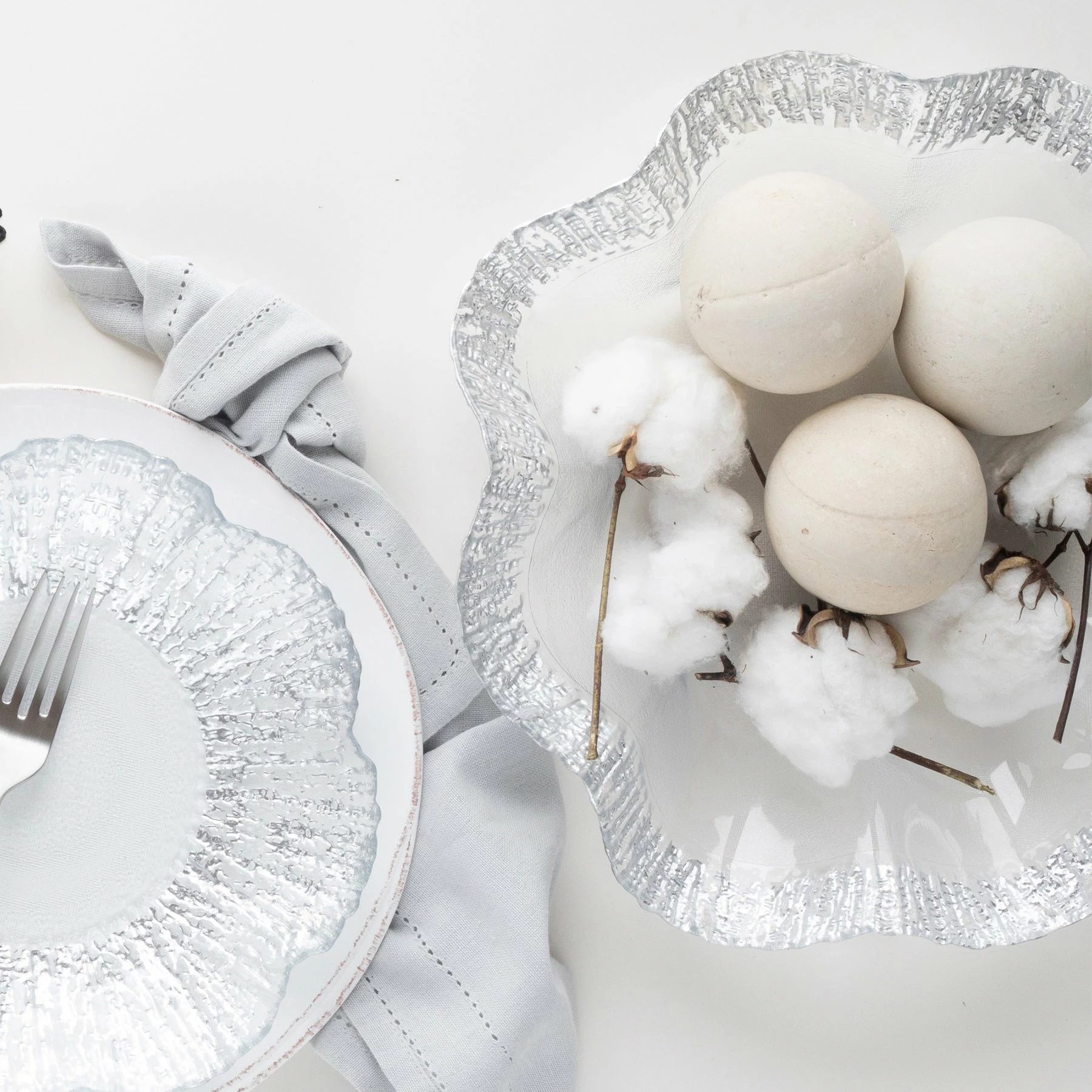 The Rufolo Glass Platter features glowing strands on the border of the elegantly ruffled platter. The embellishment is effortlessly beautiful.