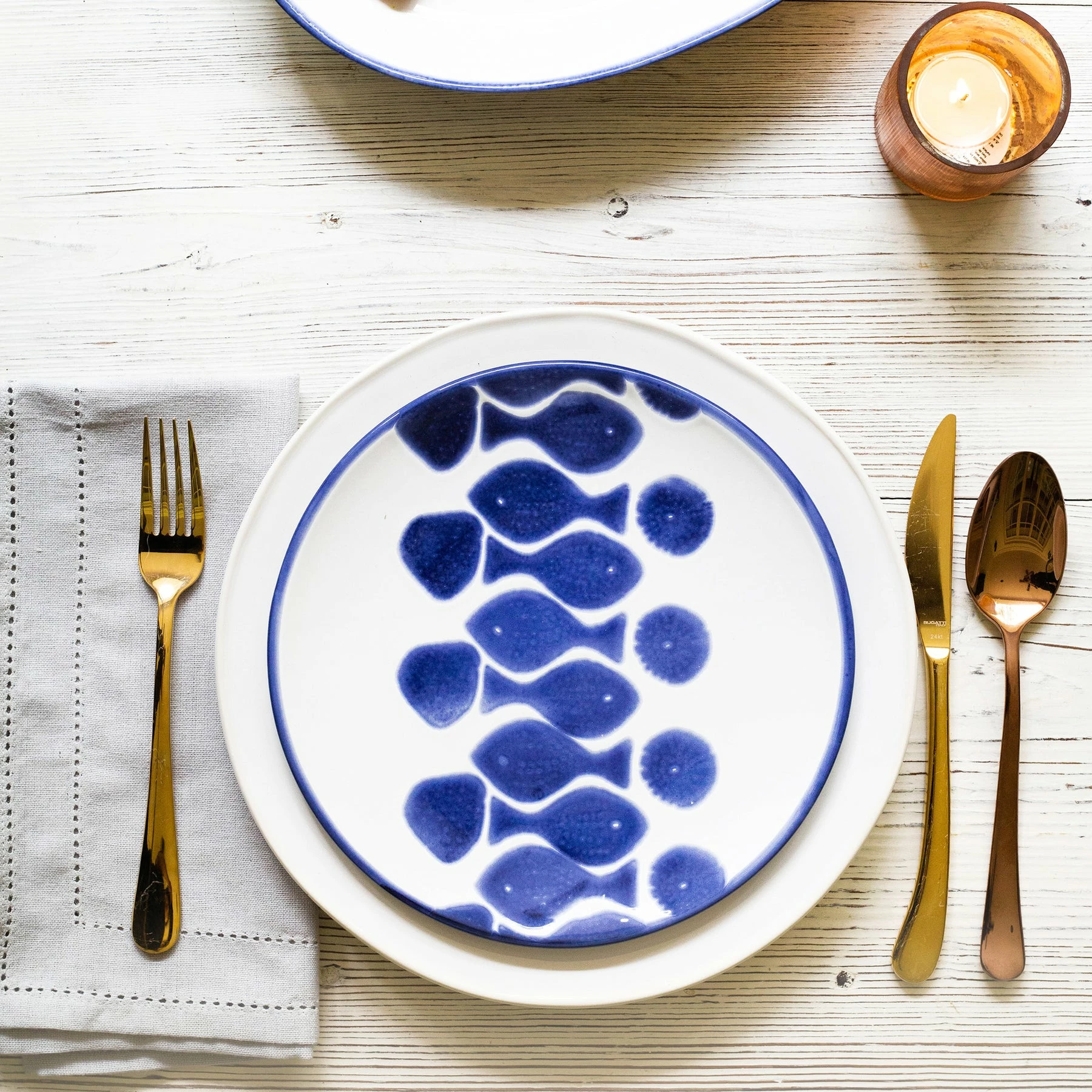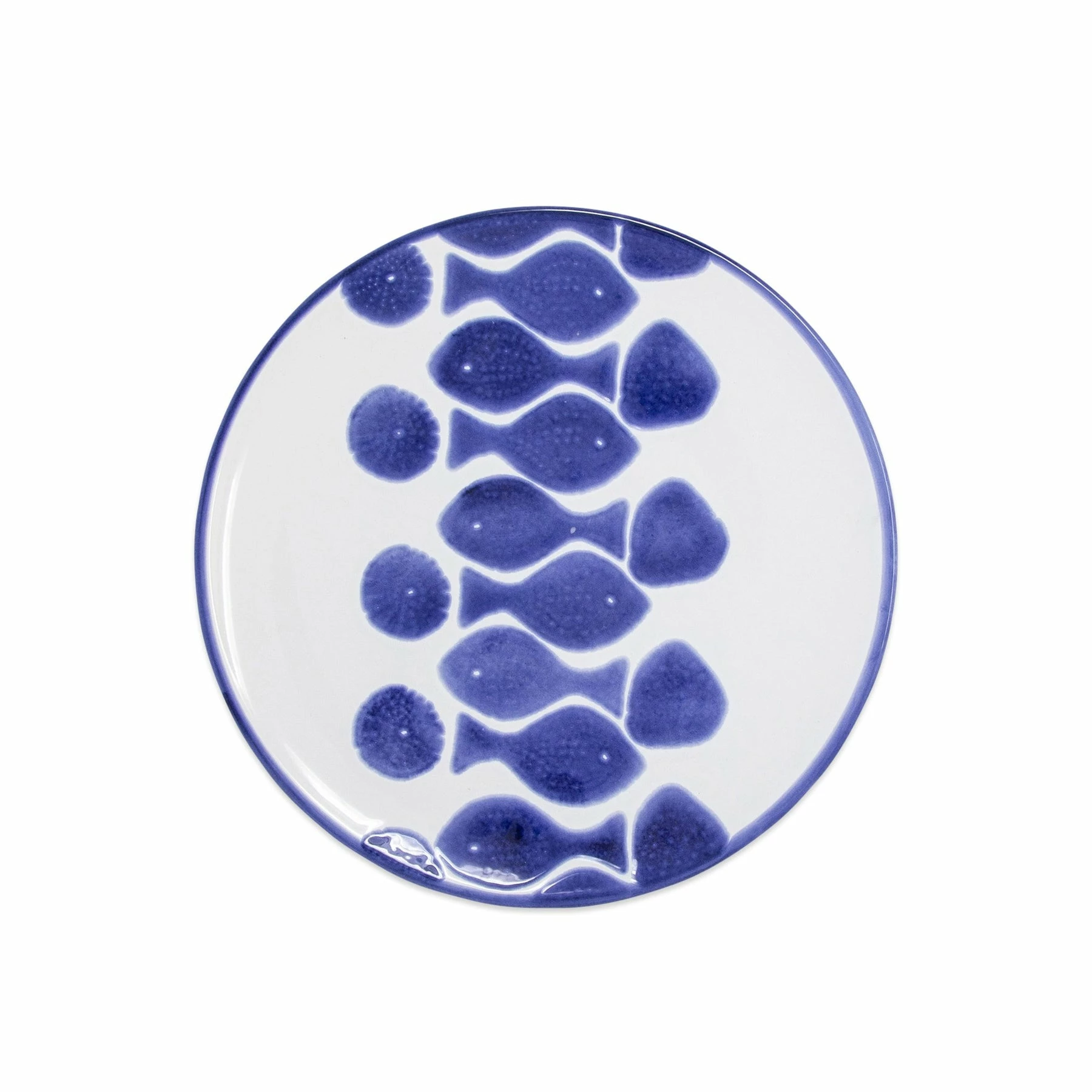 Make everyday entertaining a splash with the playful design of the Santorini Fish Salad Plate, a perfect mix of blue and white that easily layers with the mosaic patterns of Santorini.